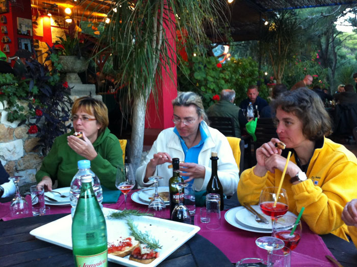 Am Dienstag endlich erfreut uns eine schöne Navigationswettfahrt Milna –Hvar. Gleich nach dem Zieldurchgang vor der Marina Palmizana geht es durch die Durchfahrt in den Süden(weniger Seegang!) der Pakleni Inseln zum Start zur 2.WF bei anspruchsvollen 3-6 BF und ordentlichen Wellen im Uhrzeigersinn rund um diese Inselgruppe. Den krönenden Abschluss bildet das fantastische Essen in Palmizana und die Freude über je 2 2. und 3. Plätze und Zieldurchgänge teils vor den größeren Booten.