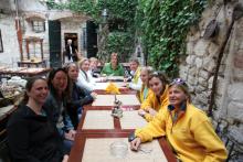 12 Frau hoch fahren gemeinsam am Samstag bei angenehmem Wetter in die Marina Kastela bei Split, wo wir unsere 2 First 35 problemlos übernehmen und am Abend gemütlich im Ort Kastela ausgezeichnet Essen gehen.