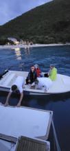 Donnerstag wird der aufregendste Tag: ca. halbe Stunde nach Ablegen von der Boje und entlang der Pakleni Inseln nach Westen motorend, Alarm !!!!! Wir setzten sofort Segel und schauen nach was sein könnte, finden nichts. Anruf bei Technikern von Pitter aus der nächsten Marina Milna! Nach genussvollem Segeln bis vor Milna kommen die Techniker längsseits und checken gute halbe Stunde den Motor und - finden auch nichts! Muss die Elektronik sein ist ihr Ergebnis. Der Drehzahlmesser zeigt nach wie vor nichts an und gibt Alarm! Zur Sicherheit begleiten sie uns in die Marina, (dort wartet ein Pulk von Katamaranen aufs Tanken) Unser Begleitboot führt uns elegant auf den besten Platz genau vor der Marina! Hat also alles auch sein Gutes! Und wir tanken dann stressfrei frühmorgens um 7 Uhr !